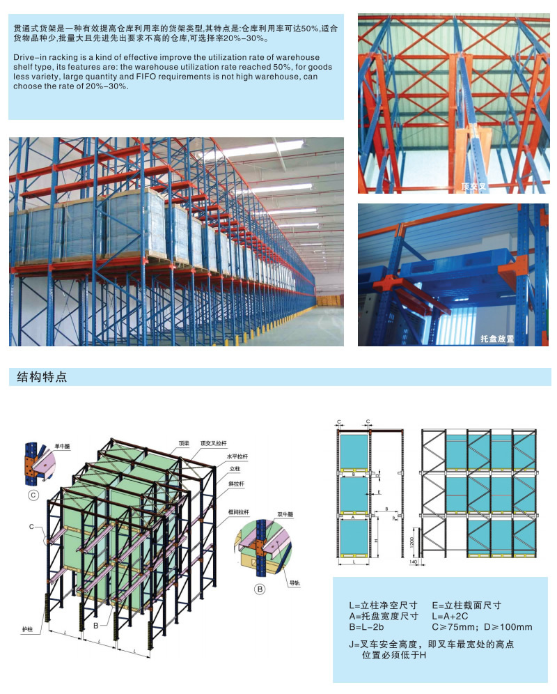 貫通式貨架又稱通廊式貨架或駛?cè)胧截浖堋X炌ㄊ截浖芸晒┎孳嚕ɑ驇ж洸娴臒o人搬運車)駛?cè)胪ǖ来嫒∝浳铮m用于品種少,批量大類型的貨物儲存。貫通式貨架除了靠近通道的貨位,由于叉車需要進入貨架內(nèi)部存取貨物,通常單面取貨建議不超過7個貨位深度。為提高叉車運行速度,可根據(jù)實際需要選擇配置導(dǎo)向軌道,與貨位式貨架相比,貫通式貨架(駛?cè)胧截浖埽┑膸炜臻g利用率可提高30%以上,貫通式貨架(駛?cè)胧截浖埽⿵V泛應(yīng)用于批發(fā)、冷庫及食品、煙草行業(yè)。