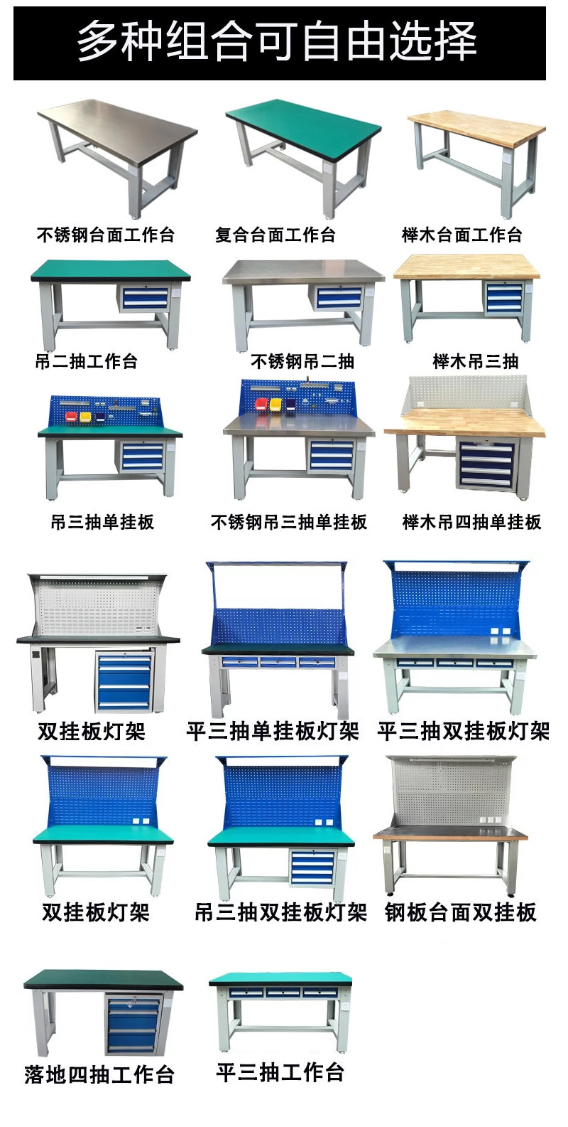工作臺采用優質冷扎板精工制作而成,堅固的工作桌框架,牢固平穩,可使工作桌承重1000kg;多種工作桌面選擇,可配合不同使用的要求;工具吊柜(箱),側柜(箱)燈架,調節腳杯,,外形美觀;層板,抽屜質量上乘,承重大,抽屜內可根據需要任意分隔;節約空間,適用性強。