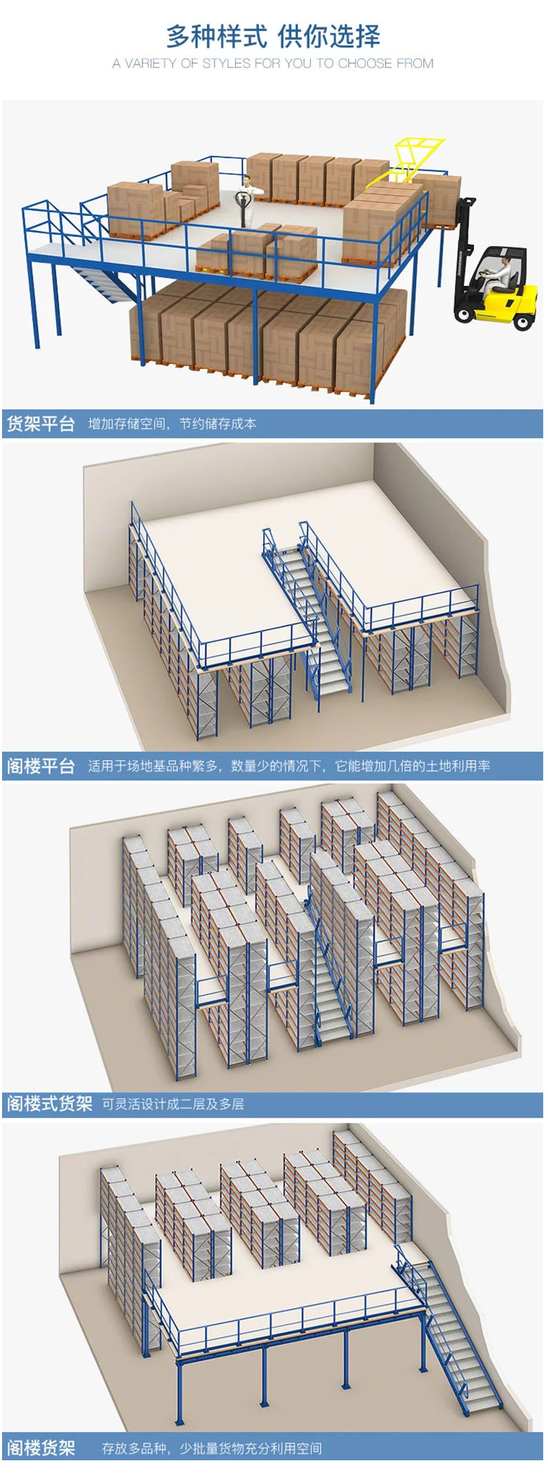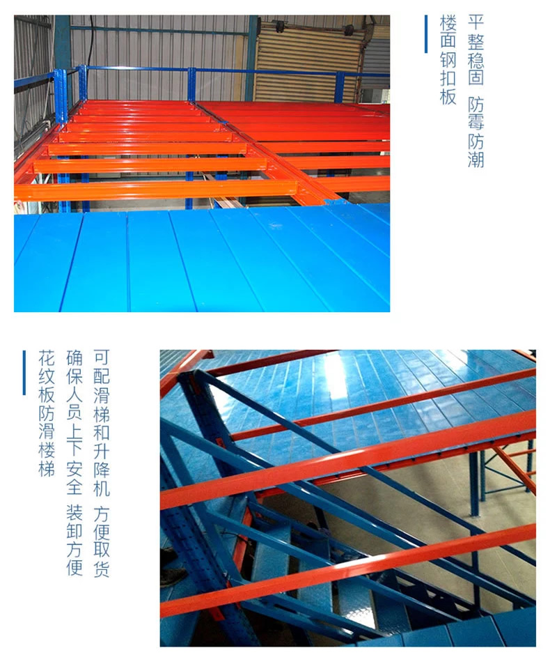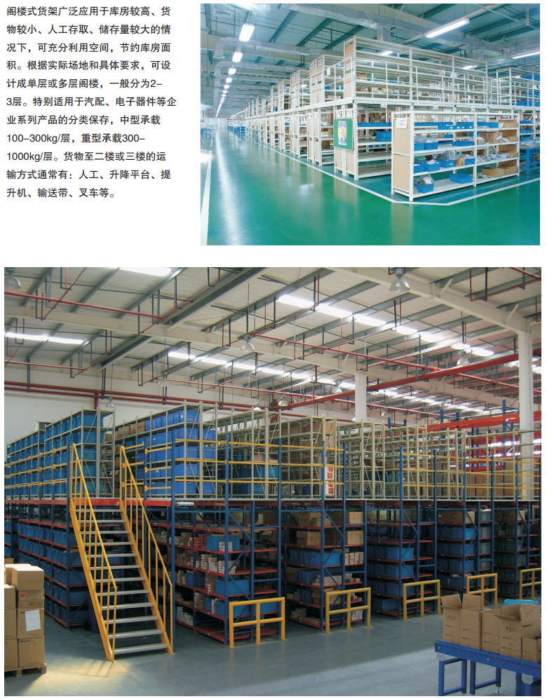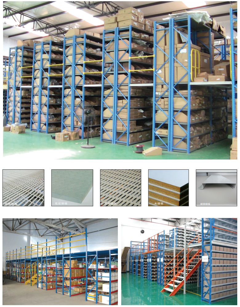 些輕泡及中小件貨物,適于多品種大批量或多品種小批量貨物,人工存取貨物,貨物通常由叉車、液壓升降臺或貨梯送至二樓、三樓,再由輕型小車或液壓托盤車送至某一位置。此類系統,通常利用中型擱板式貨架或重型擱板式貨架作為主體和樓面板的支撐(根據單元貨架的總載重量來決定選用何種貨架),樓面板通常選用冷軋型鋼樓板、花紋鋼樓板或鋼格柵樓板。