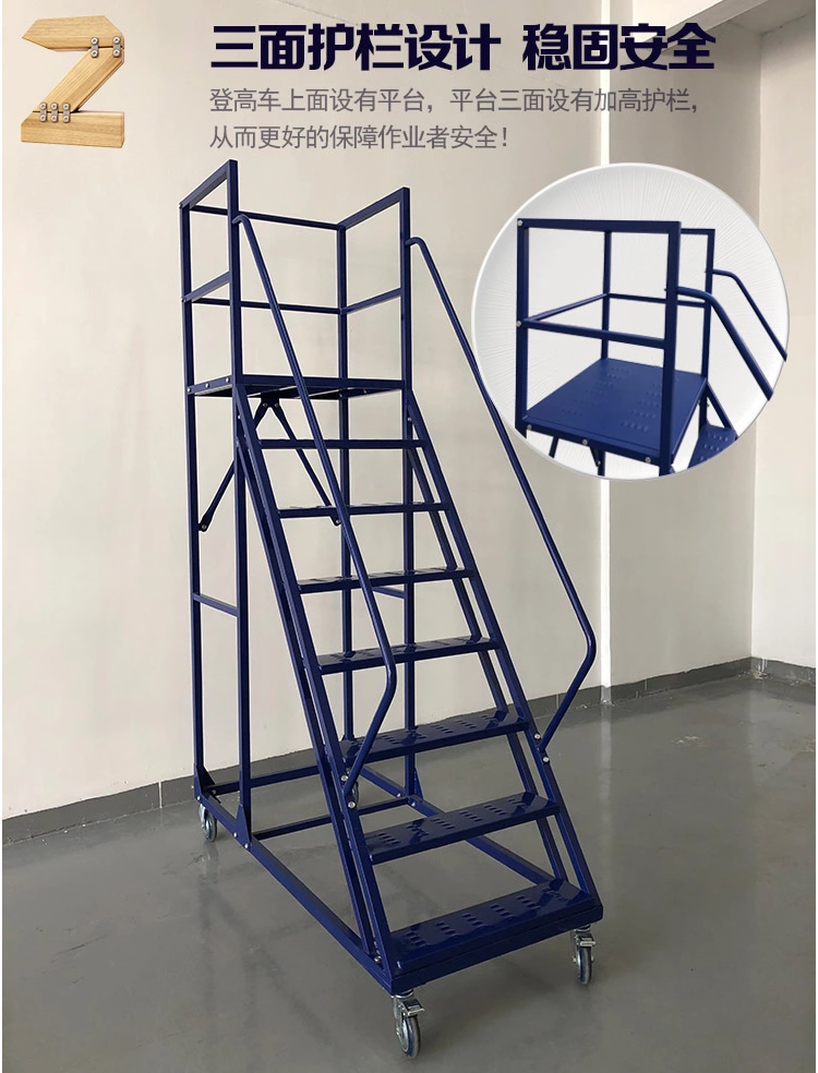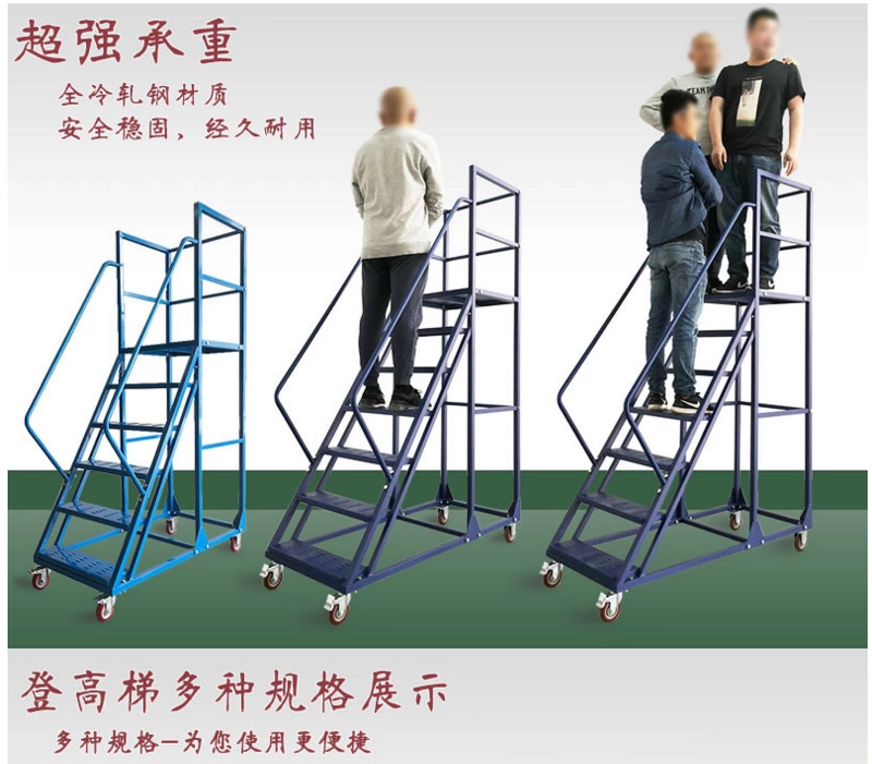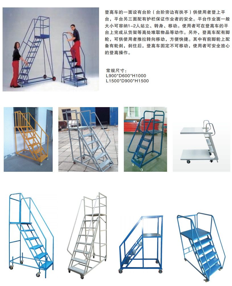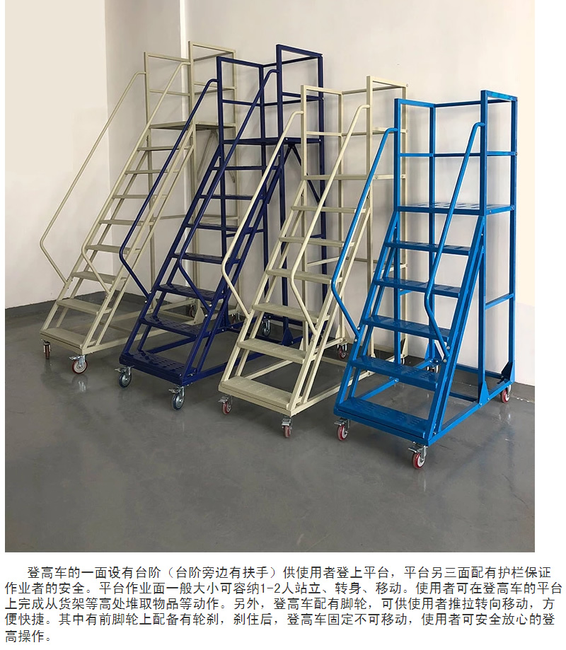 處堆取物品等動作。另外,登高車配有腳輪,可供使用者推拉轉向移動,方便快捷。其中有前腳輪上配備有輪剎,剎住后,登高車固定不可移動,使用者可安全放心的登高操作。