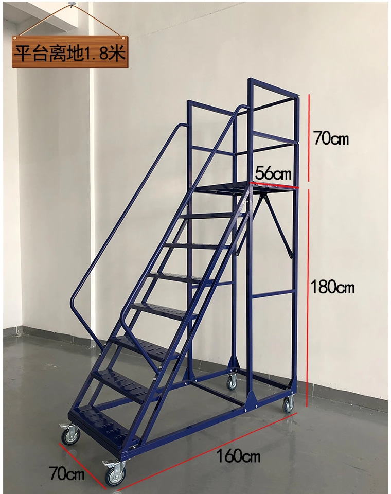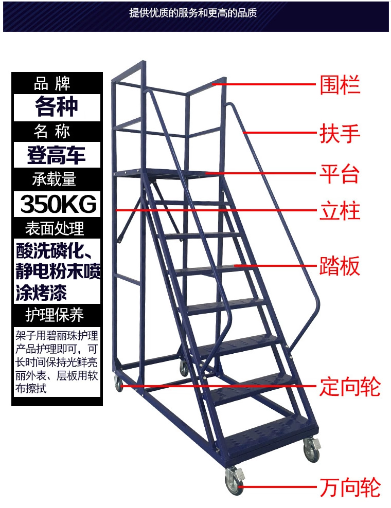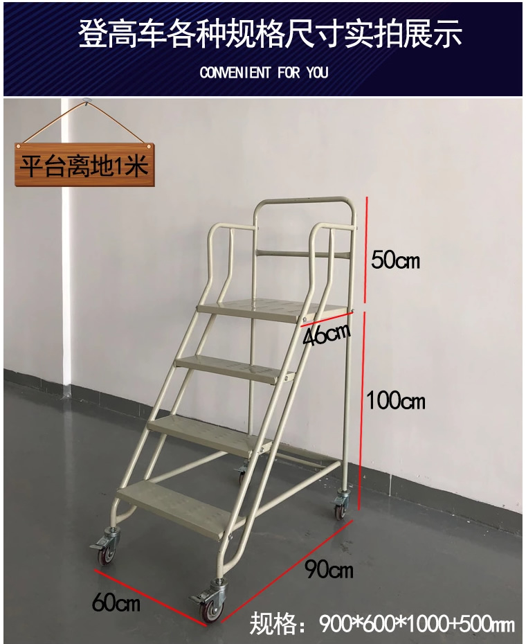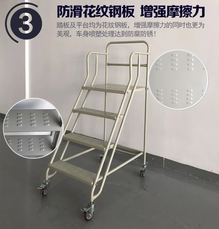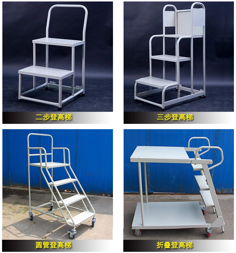 處堆取物品等動作。另外,登高車配有腳輪,可供使用者推拉轉向移動,方便快捷。其中有前腳輪上配備有輪剎,剎住后,登高車固定不可移動,使用者可安全放心的登高操作。