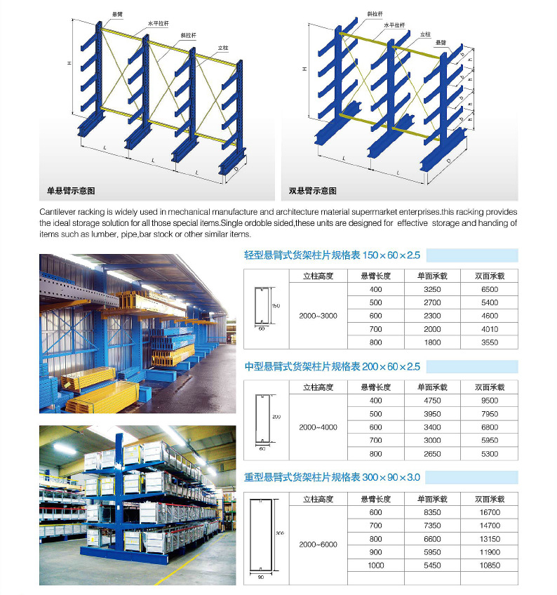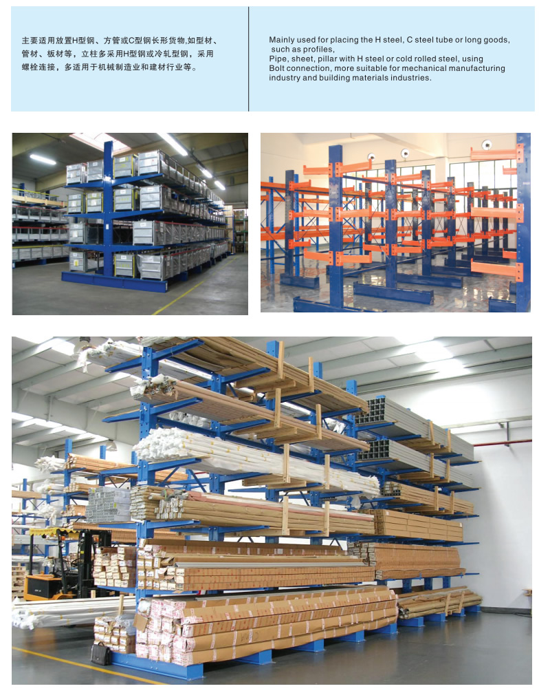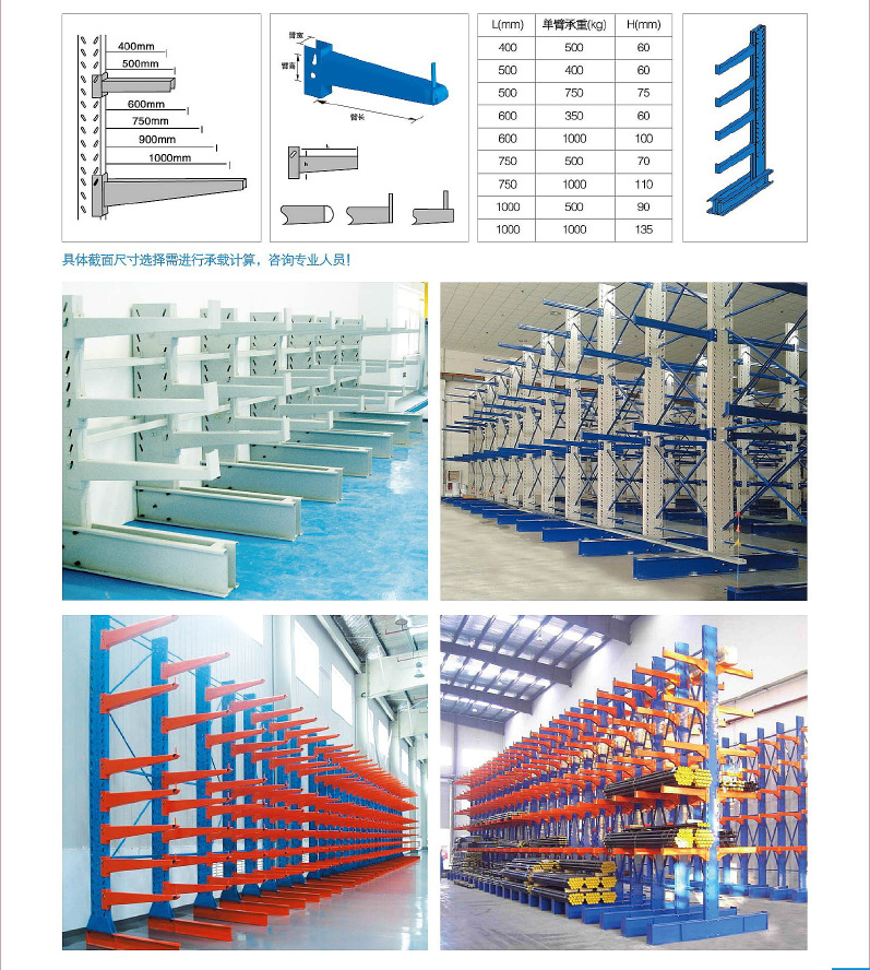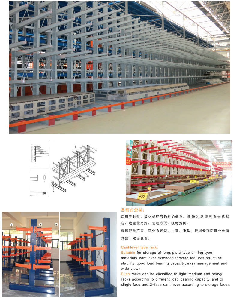 產品介紹: 懸臂式貨架適用于存放長物料、環形物料、板材、管材、及不規則貨物。懸臂可以是單面或雙面,懸臂式貨架具有結構穩定,載重能力好、空間利用率高等特點。懸臂式貨架立柱采用H型鋼或冷軋型鋼,懸臂采用方管、冷軋型鋼或H型鋼,懸臂與立柱間采用插接式或螺栓連接式,底座與立柱間采用螺栓連接式,底座采用冷軋型剛或H型鋼。